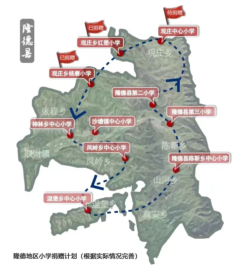 隆德县,隶属宁夏回族自治区固原市,居于银川、西安、兰州三省会(首府)城市之中。隆德县先后荣获过“中国现代民间绘画画乡”“中国文化先进县”“中国书法之乡”等殊荣,但该县相比东部地区教育水平较低,教学物资存在不足。往年我们对县内观庄乡杨磨小学、红堡小学、观庄中心小学进行了学习和体育物资的捐赠,今年的捐赠对象为凤岭乡中心小学以及温堡乡中心小学。