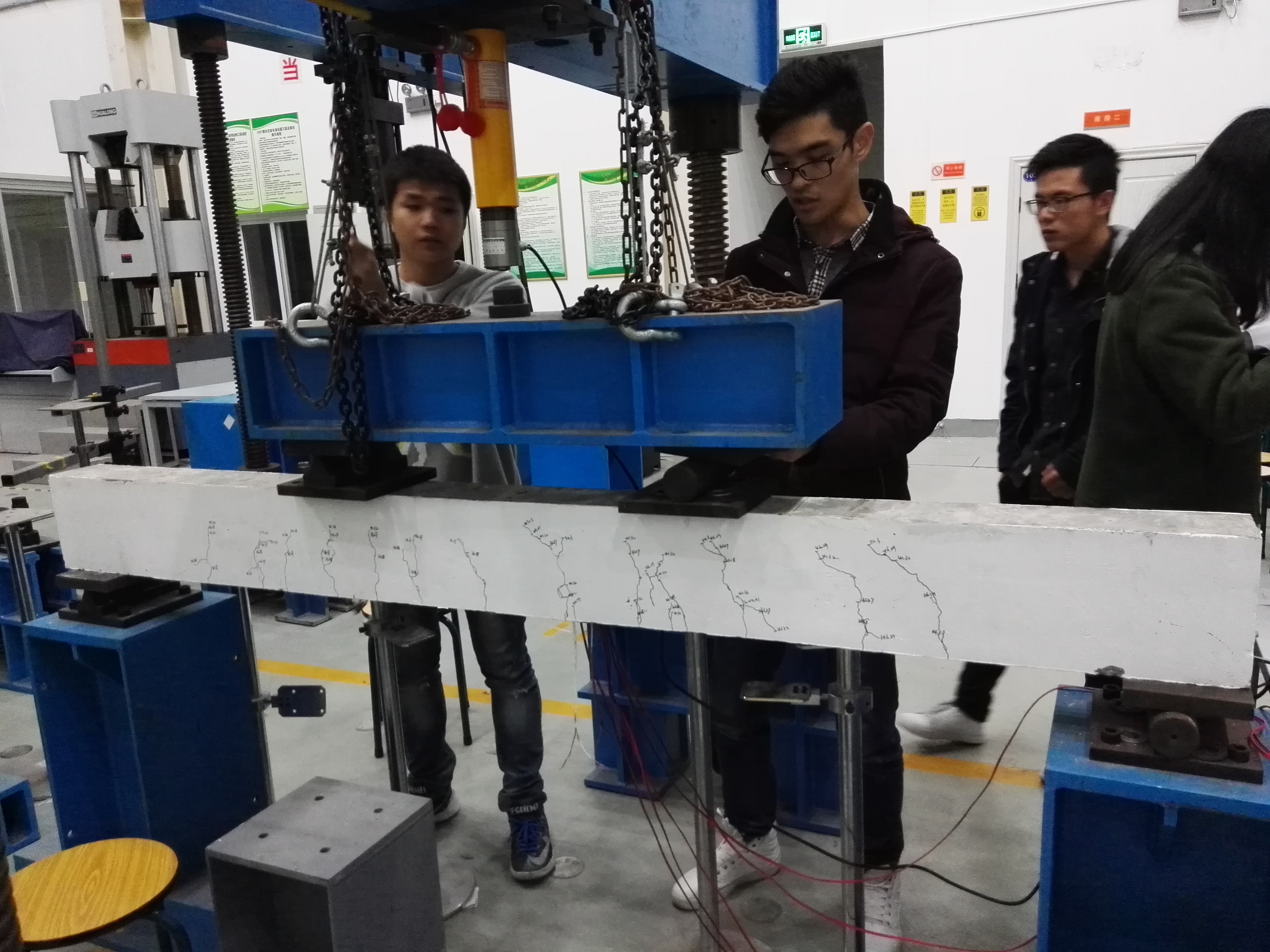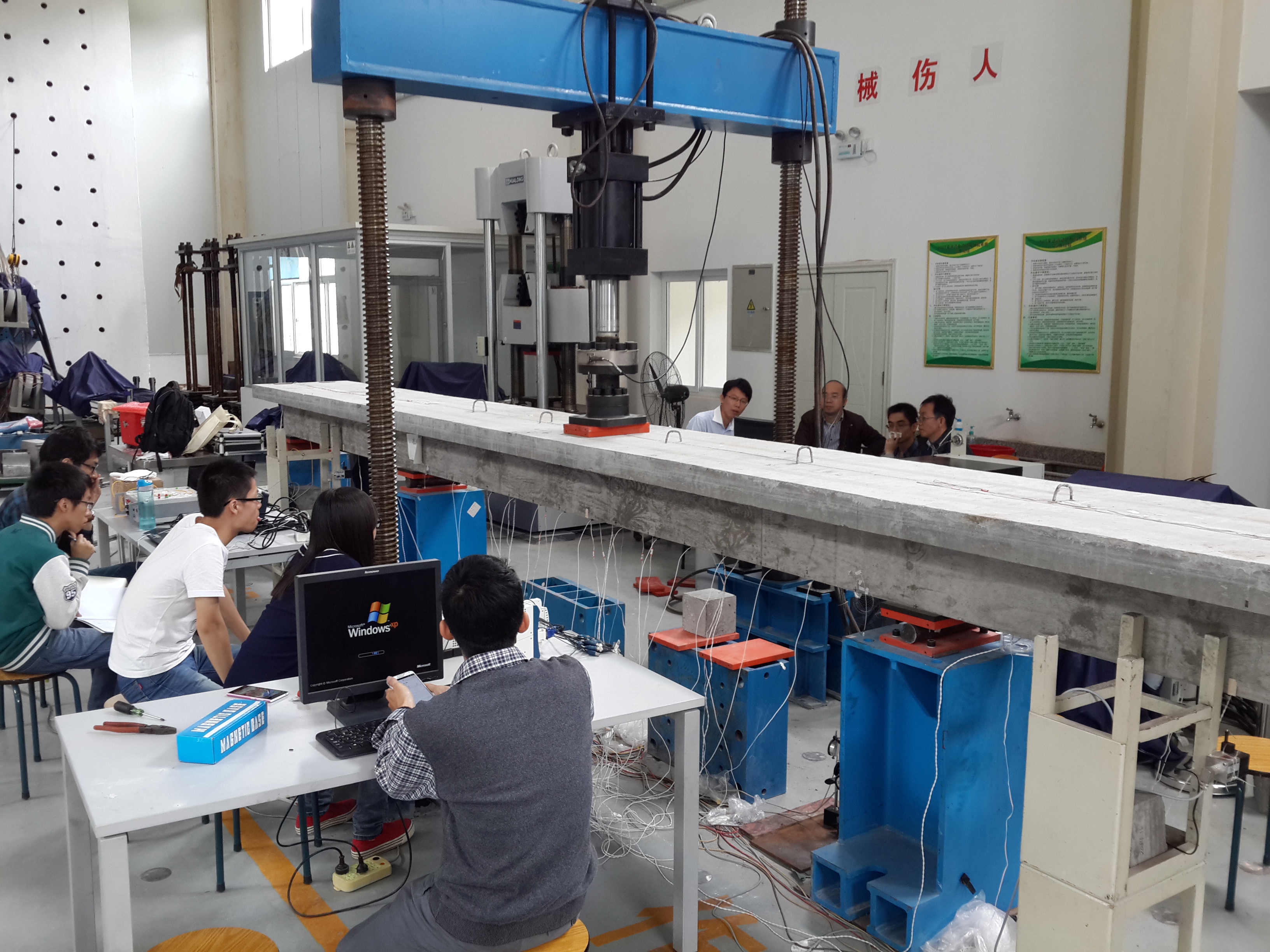 结构工程实验室现有人员3人,其中专业教师1人、实验技术人员2人,主要承担土木工程专业《结构实验理论与实践》课程的实验教学任务。按教学计划主要开设的实验项目包括常用加载设备及量测仪表的使用技术、简支钢桁架非破损试验、回弹法检测混凝土强度、电阻应变片的粘贴和测量技术、钢筋混凝土简支梁试验等,均为综合型实验。结构工程实验室主要面向土木工程专业三、四年级学生。同时,结构工程实验室还可开展钢筋混凝土短柱破坏试验、钢架动载试验、结构模型地震模拟振动台实验、超声法评定混凝土强度及检测混凝土内部缺陷试验,钢筋检测,金属超声波探伤等,可供大学生进行课外创新实践活动、结构设计大赛以及研究生实验课程和毕业论文试验等项目。本实验室钢结构厂房屋架及吊车本身可供土木工程专业学生进行有效的认识实习,是固定的实习基地之一。